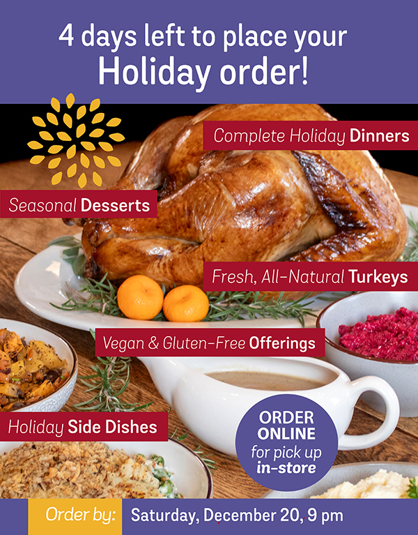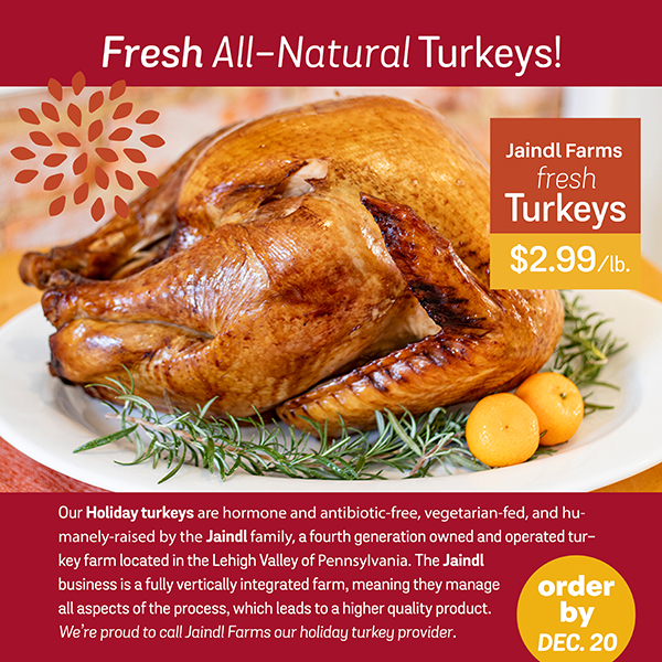 Our fresh, all-natural turkeys are from Jaindl Farms.
